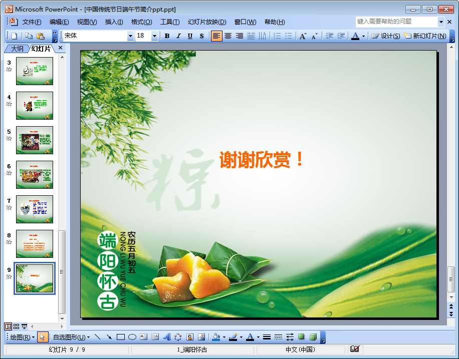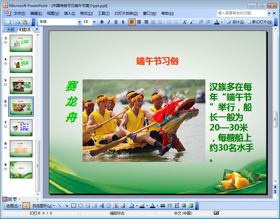 这是一份介绍端午节的ppt,该ppt主要介绍了端午节的由来,端午节各地的风俗习惯,以及与端午节有关的诗词等,2015年端午节就要来了,如果你需要一份与端午节有关的素材或是ppt模板,那么相信这份中国传统节日端午节简介ppt会对你有所帮助的哦!有需要的朋友点击本文相应的下载地址进行下载即可,欢迎有需要的朋友进行下载!