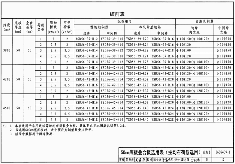 《预应力混凝土叠合板(50MM、60MM实心底板)06SG439-1》按预应力钢筋为螺旋肋钢丝、冷扎带肋钢筋两种情况提供了110mm、120mm、130mm、140mm、150mm五种厚度的叠和板。每种叠和板提供按均布荷载选用、按内力选用两种用表供设计人员直接选用;提供底板材料表、结构性能检验表供参考;提供叠和板连接构造做法示意供设计人员参考使用。