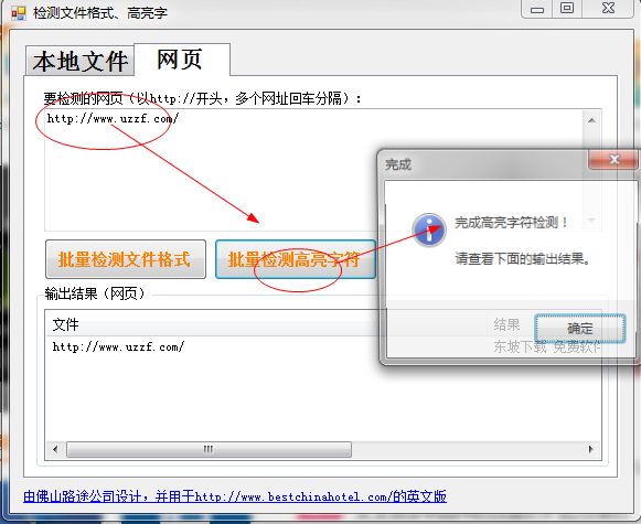 这个程序是为了方便网站开发者避免乱码问题的。通过批量检测本地文件和网页的格式,保证文件都为统一编码,以防因文件格式而导致某些页面出现乱码。通过批量检测本地文件和网页的高亮字,这对于做英文站来说及其重要,以避免页面出现中文字等,这将在老外的电脑显示???或口口口的乱码。
