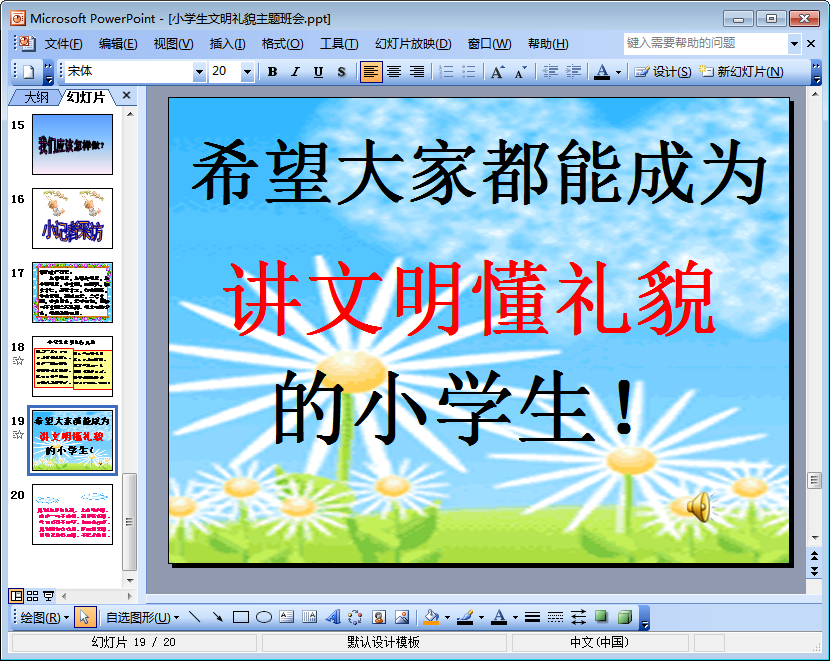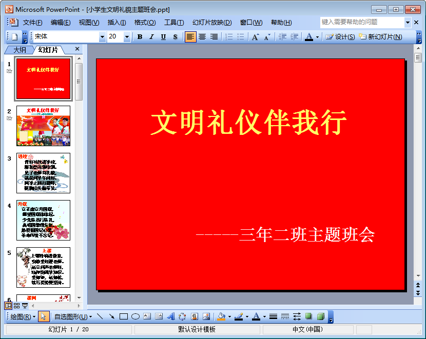 小编在这里为大家整理带来的是一份主题为“文明礼仪伴我行”的ppt,该ppt适合作为小学生文明礼貌主题班会课件使用,ppt共有20页,内容完整,图文并茂,适合作为小学阶段的教学辅助资料使用,该文明礼仪主题班会ppt为免费版,有需要的朋友可以放心下载使用!