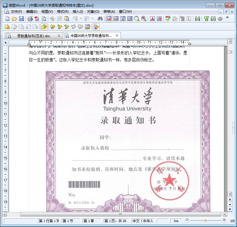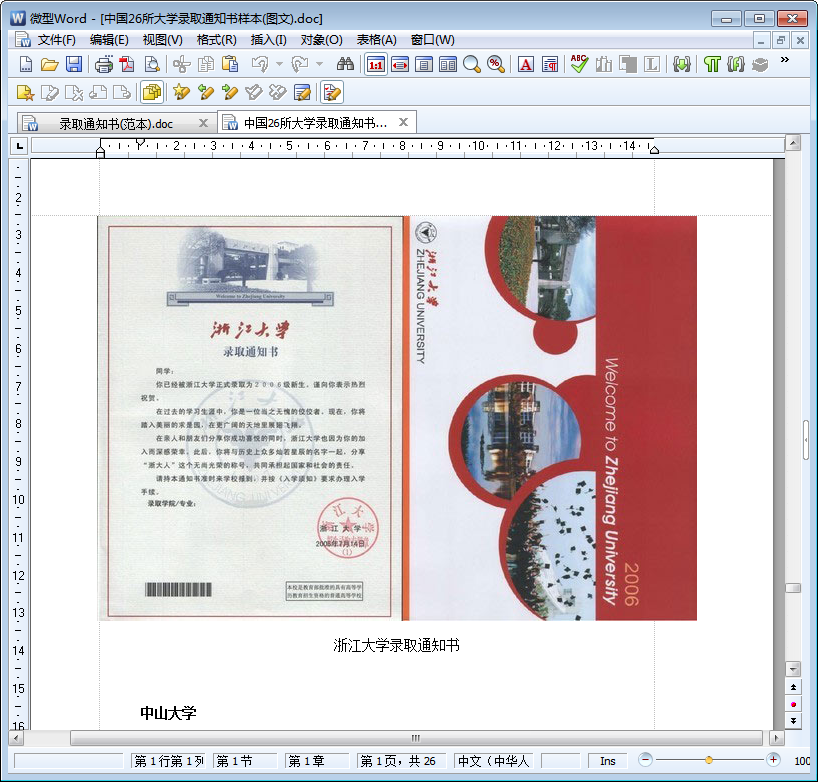 本节内容小编为大家精选带来的是一份大学录取通知书模板,当然,这也不仅仅是一份录取通知书范本,因为在这份文档中还包含有中国26所大学录取通知书样本,以下有该文档中模板到的相关图样,如果你需要查阅的话,只需点击本文相应的下载地址进行下载即可!该文档为doc格式免费版,欢迎有需要的朋友下载查阅哦!