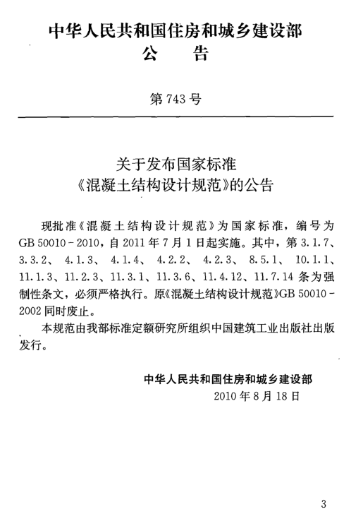 《中华人民共和国行业标准(GB50010-2010):混凝土结构设计规范》适用于房屋和一般构筑物的钢筋混凝土、预应力混凝土以及素混凝土结构设计。2011-07-01实施。