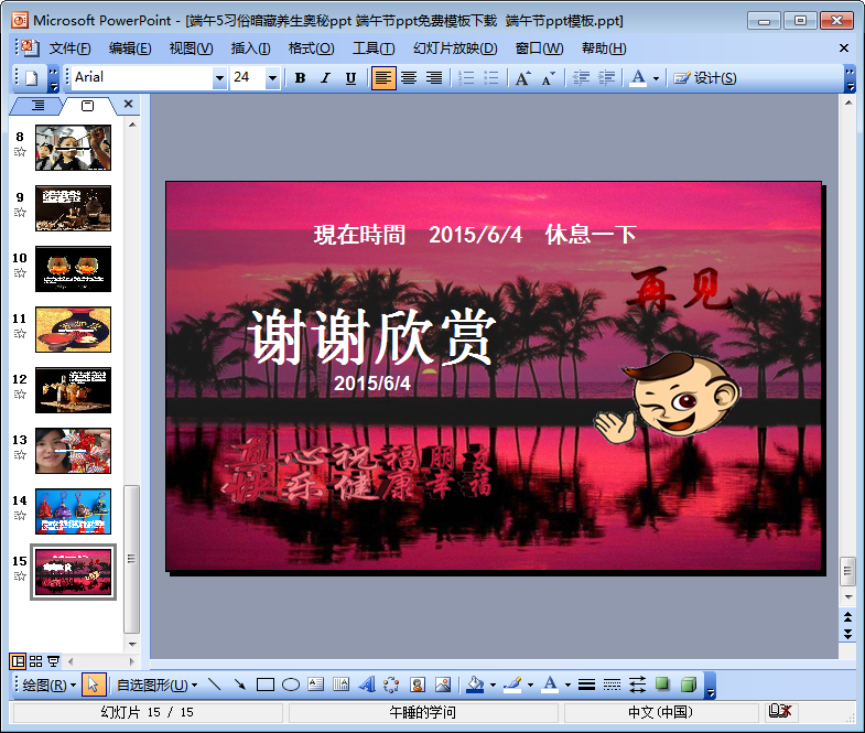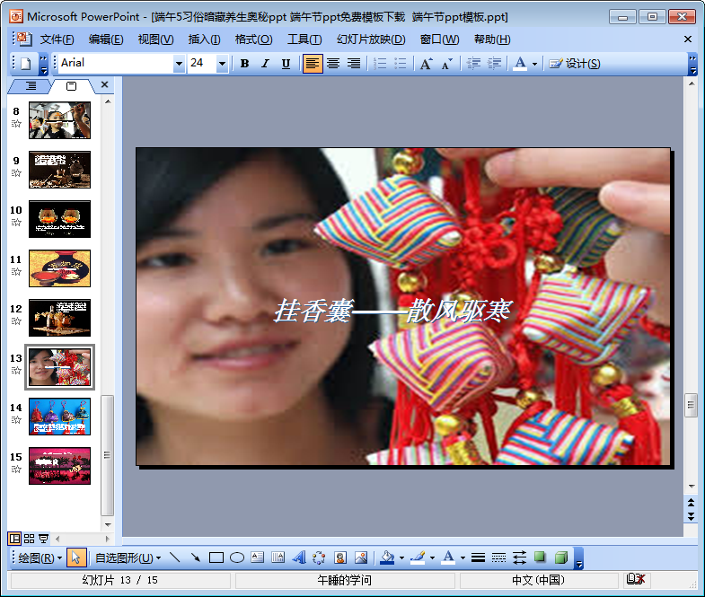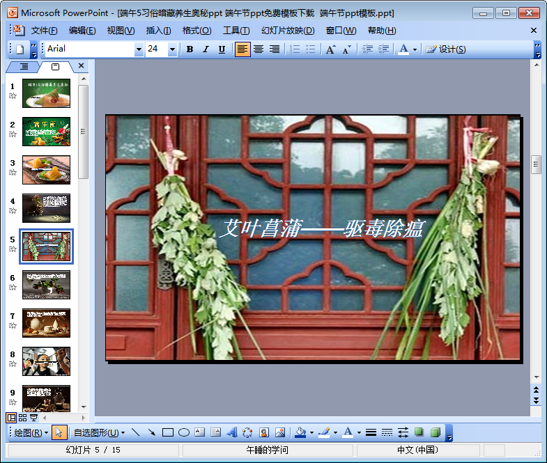 本节内容小编为大家整理带来的这份以端午为主题的ppt主要讲述的是端午五大习俗暗藏的养生奥秘,想知道端午节有哪五大习俗吗?想知道这些习俗中都有什么样的养生窍门吗?如果你的回答是肯定的,那么就赶紧来下载这份端午节ppt课件之端午五大习俗暗藏养生奥秘ppt来看看吧!ppt内容完整,背景与端午节这一主题遥相呼应,有需要的朋友也可将其作为端午节ppt背景模板使用哦!