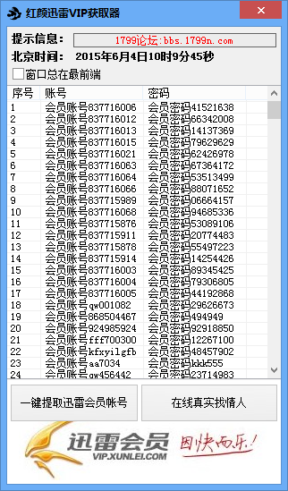 红颜迅雷会员获取器是一款迅雷会员账号获取器,每日更新大量的迅雷会员VIP账号,享受超快速的迅雷下载,就用红颜迅雷获取器
