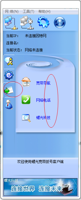 螺光宽带拨号客户端内置的辅助功能,具有绿色无插件,拨号速度快,占用资源少,并可以设置自动运行,自动拨号,断线后自动重连,定时关机,拨号连接使用代理等功能。