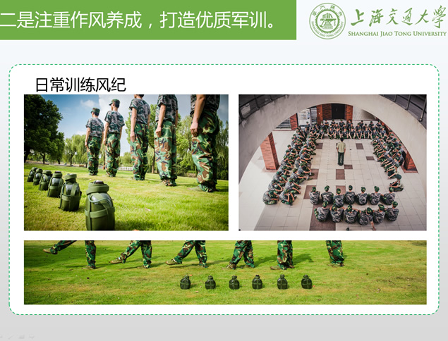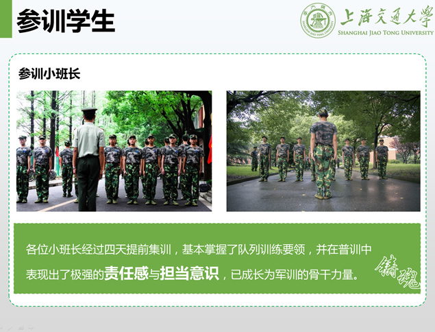 每个刚进大学的同学都会军训,这里带来一份详细完整的上海交通大学军训工作总结ppt,幻灯片共计25页,有需要军训ppt模板和大学军训生活回忆的朋友点击下面的地址免费下载。
