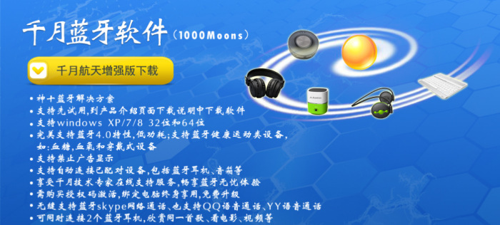 “千月”主要功能包括蓝牙局域网(PAN)、蓝牙高质量音频(A2DP,HFP)、蓝牙图像传输功能(BIP)、串行端口功能(SPP)、蓝牙打印服务(HCRP)、蓝牙文件传输服务(FTP)、蓝牙信息交换服务(OPP)、蓝牙拨号上网服务(DUN)。轻松实现台式机或笔记本与各种蓝牙设备的连接;完成与手机的文件交换、无线接入 Internet、使用蓝牙鼠标、键盘、通过蓝牙耳机听音乐等各种应用。可支持 Windows 2000/XP/Vista 以及 Win7系统平台。 另外,用户通过操作界面窗口,就可直接进入购物、资讯、手机游戏下载等附加栏目。