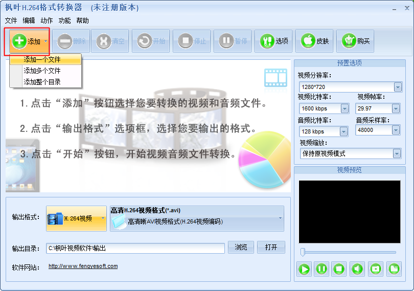 枫叶h.264格式转换器是一款HD高清视频格式转换工具,转换速度快,支持批量转换,可以将H.264编码的视频转化成流行的视频格式,如AVI, MPEG, WMV, DivX, MP4, MKV, VOB, MOV, XviD, 3GP, FLV, SWF,MPG等等几十种视频格式。