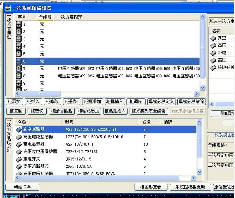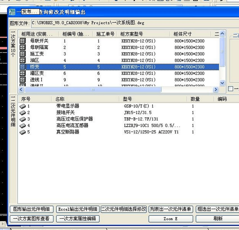 ○ 通过一次方案查询修改及明细输出,可对当前图中的一次方案进行编辑修改;可输出一次元件清单以及每个方案的一二次元件明细表。