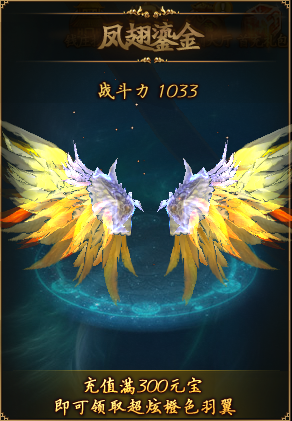 累积充值达到300元宝,即可免费领取神魔羽翼,独一无二的酷炫外观,还可为您带来属性与战斗力的大幅飙升!