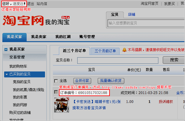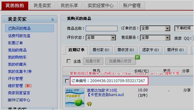 2、复制订单编号,访问 http://kami.sududa.com/tiqu/ 即可提取卡密