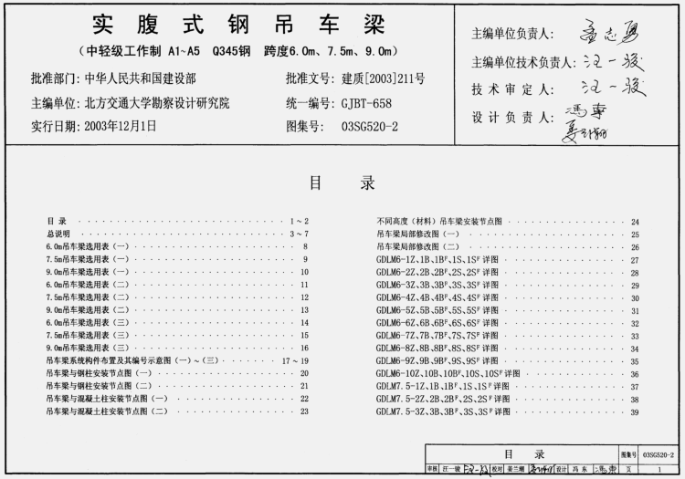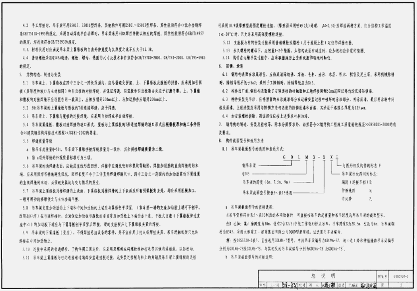 本图集为跨度6m、7.5m、9m,分别适用于柱距6m、7.5m、9m;适用于非抗震设计和抗震设防烈度6~8度地区、环境类别为一类;03SG520-1和03SG520-2是分别按照起重量为3t~50t和5t~50t的,中、轻级(A1~A5)工作制一般用途(软钩)吊车设计的。