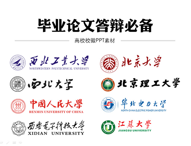 这里小编分享一份高校校徽ppt素材,包含了各个高效的校徽图标,北京大学,清华大学,西北大学,广州大学······毕业论文答辩必备,需要的同学朋友们可以点击下面的地址免费下载使用。