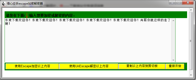 escape加密是现在比较流行也是非常的安全的一种加密方式了,下面的这款得心应手escape加密解密器可以将任何字符使用escape加密,也可以将escape加密后的字符使用Unescape解密,支持将加密&解密后的字符复制到剪切板,简单、方便、快捷、迅速、一键操作、绿色软件、无毒、无插件、可放心使用!