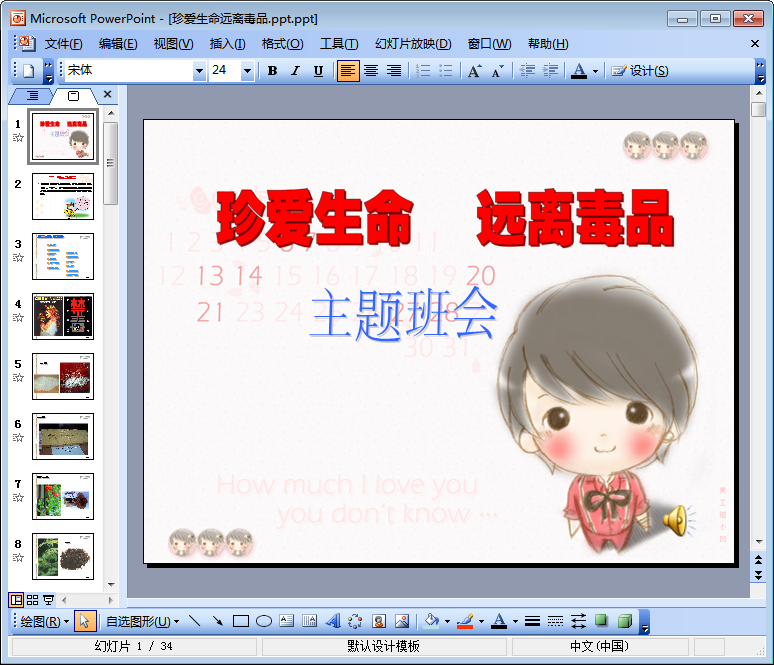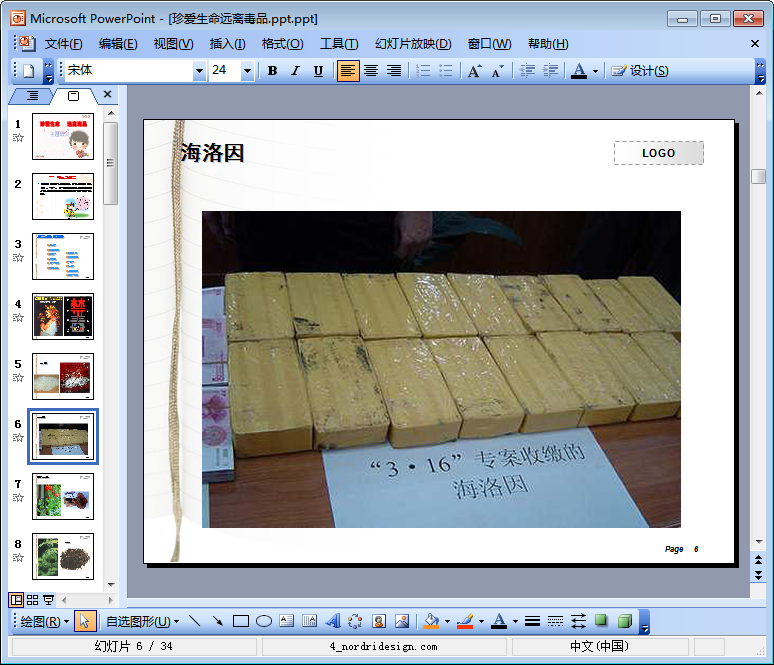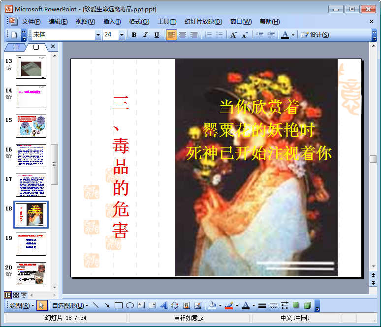 6月26日是国际禁毒日,如果你需要在班级范围内容召开一次主题为“珍爱生命远离毒品”的班会,那么不妨就来看看小编为你整理带来的这份珍爱生命远离毒品ppt吧!该ppt共有34页,ppt详细介绍了毒品的危害等,并配有图文说明,易于学生理解。以下是该ppt的相关内容介绍,如果你需要下载这份ppt的话,只需点击本文相应的下载地址进行下载即可!