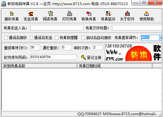 软件采用国际最新传真编码通信处理技术,支持Class1/Class1.0/Class2/Class2.0/等各种新老制式调制解调器MODEM(俗称猫),支持内部分机和网络IP电话或电话卡拨号。