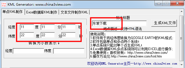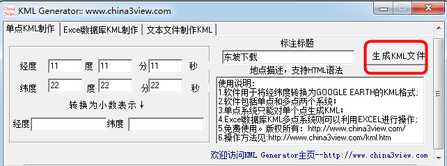 1.软件用于将经纬度转换为GOOGLE EARTH的KML格式