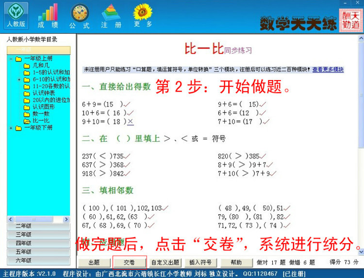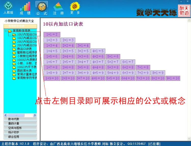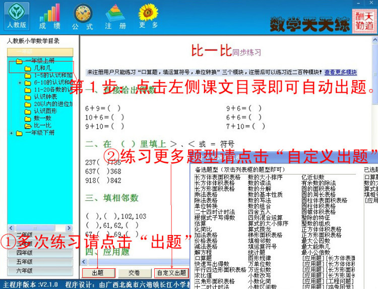 它不仅包含了几百个可以任意出题的模块题型,还包含了依赖于数据库的填空题和应用题,能够根据设定的算法与题目中数字的变化来完成一道同类型的不同题目,好包含了傻瓜式的判断题和选择题,其中也是都能够自由自由变化的题型,成千上万道模块题足够每一位小学生小学六年打好基础和训练提高使用。