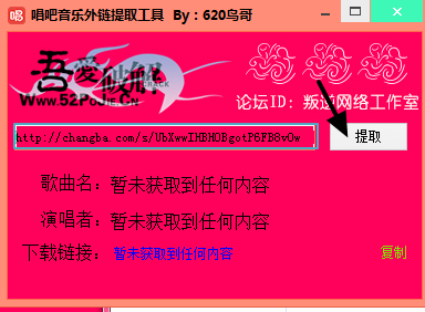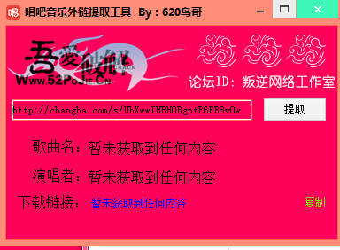 620鸟哥唱吧音乐外链提取工具(唱吧音乐下载外链提取工具)是一款只要正确输入唱吧地址,点击获取,解析,查看,就可以提取到正确的mp3地址,还可以试听,有需要的赶紧来下载使用吧。