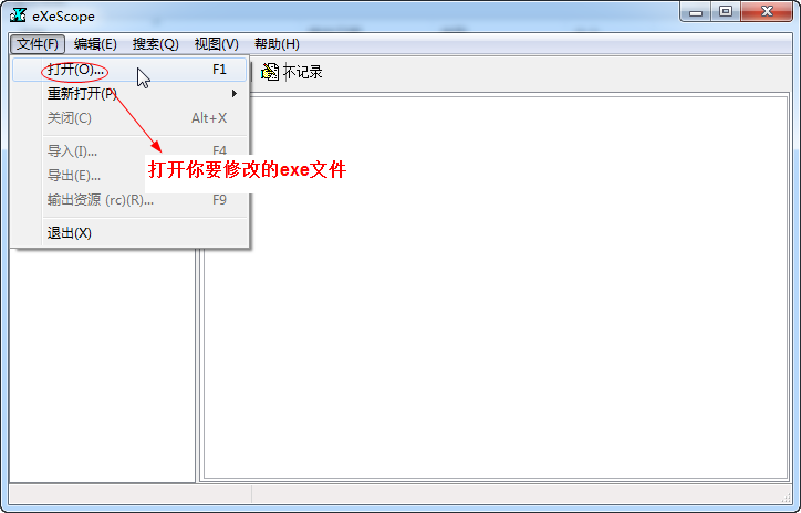 2、打开eXeScope,点击【文件】--》【打开】,选择你要修改的exe文件