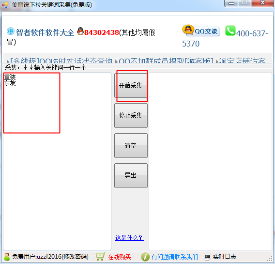 2、进入界面后,在左侧输入要采集的关键字,一行一个,点击开始采集按钮。