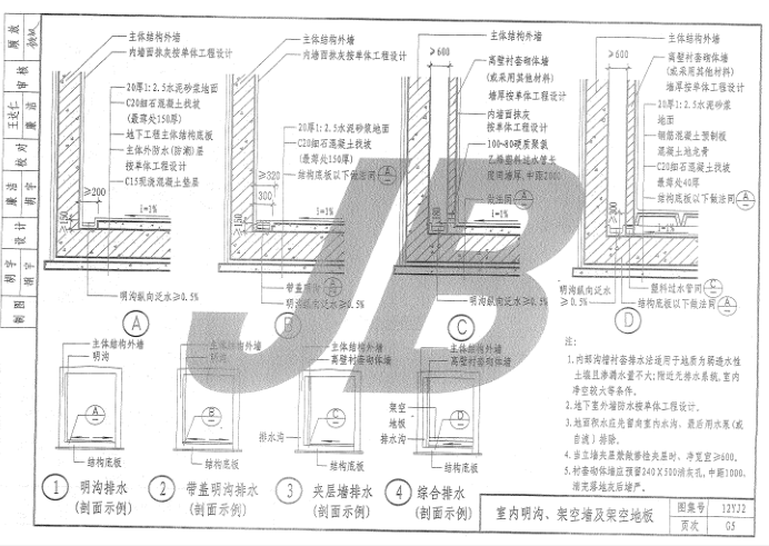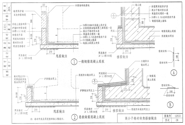 12YJ2地下工程防水图集适用于一般民用与工业建筑地下或半地下防水工程,本图集内容包括防水混凝土、水泥砂浆防水、卷材防水、涂料防水金属防水、排水措施等七大部分。