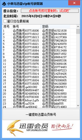 小菜鸟迅雷vip帐号获取器是一款迅雷账号获取器。他能帮你自动获取迅雷的VIP账号。花钱买神马的再也不需要了。有需要的快来下载使用吧!