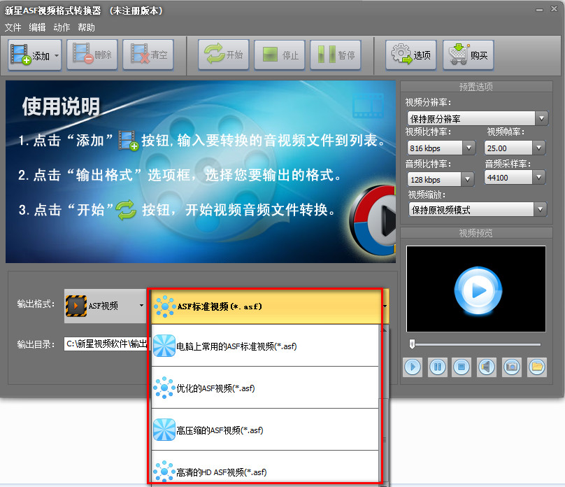 专为微软ASF视频而开发的视频格式转换工具——新星ASF视频格式转换器是功能全面且专业的视频格式转换工具,它能将ASF转换成AVI、MP4、MPEG、WMV等等常用的视频格式。还可转换ASF为安卓手机、iPhone、iPad、iPod所能完美播放的视频。