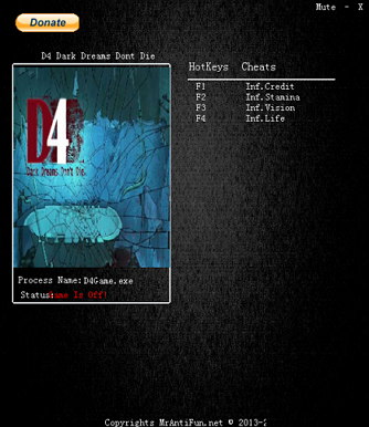 D4暗梦不灭四项修改器使用了这款功能可以在游戏里获得很多强大的功能比如无限金钱、无限体力、无限条命喜欢的赶紧来下载使用吧。