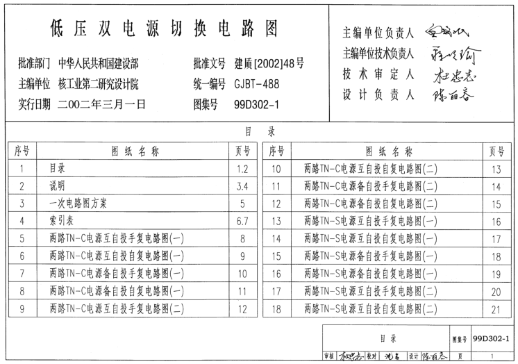 99D302-1低压双电源切换电路图,简称为99d3021图集或是低压双电源切换电路图。本节内容小编为大家整理带来的这份99d3021图集为pdf格式免费高清版,图集内容完整,样张清晰,适合作为打印资料使用,如果你需要这份pdf格式99D302-1低压双电源切换电路图的话,那就赶紧点击本文相应的下载地址来进行下载吧!