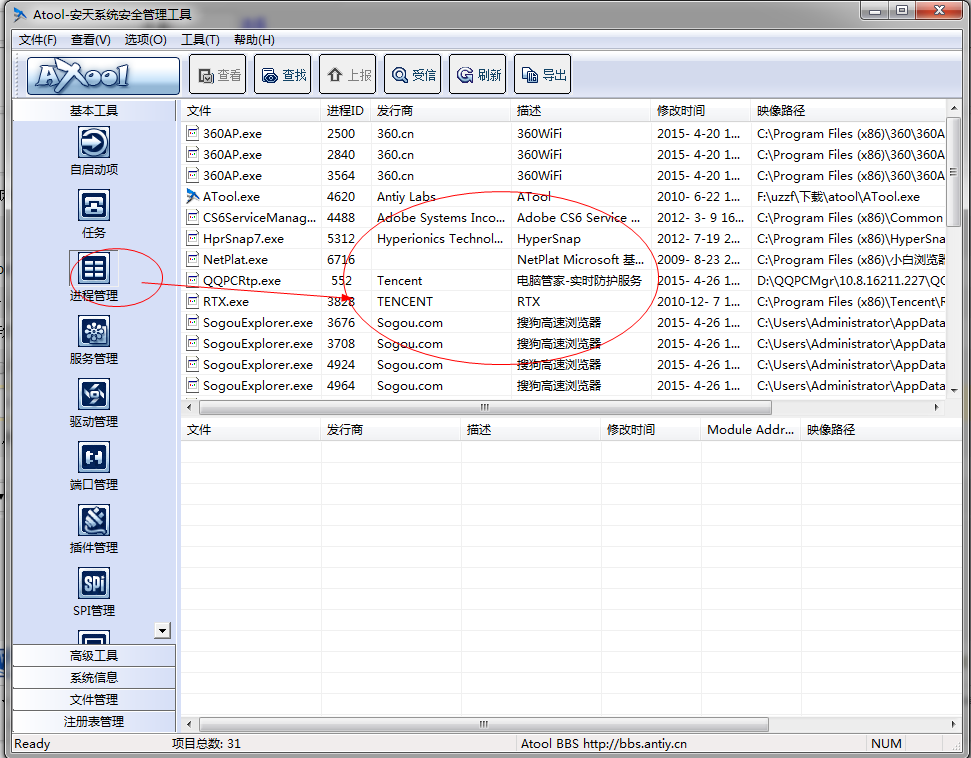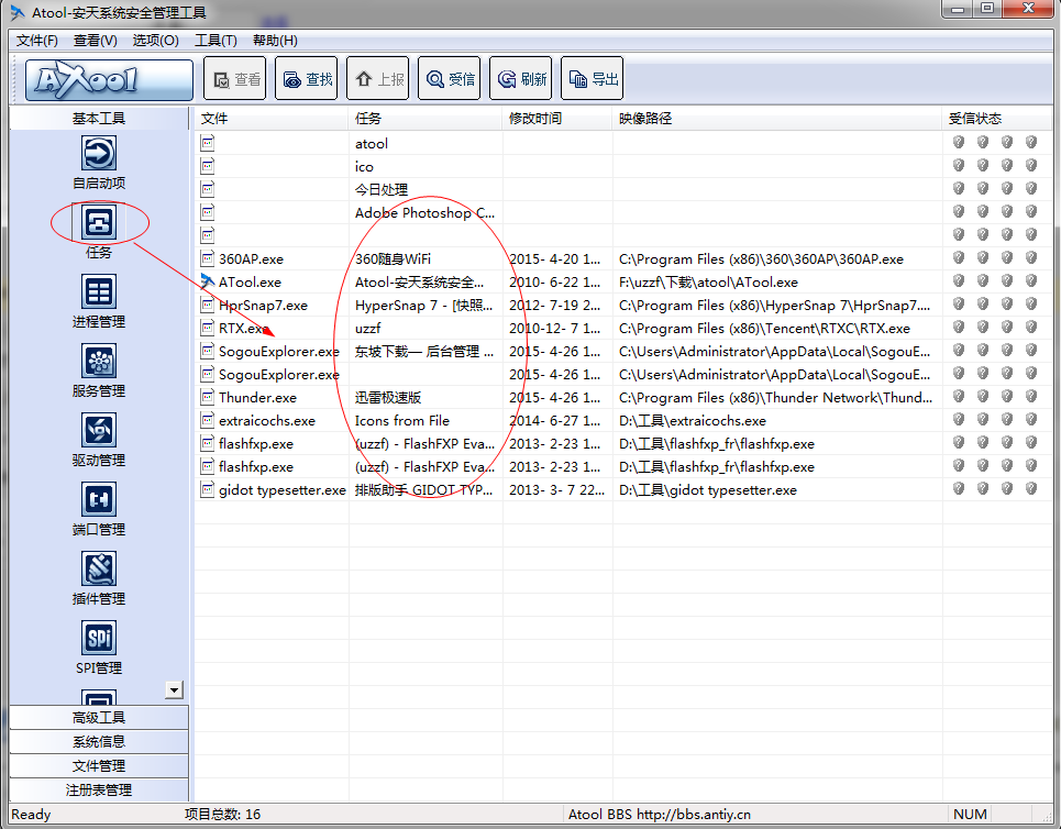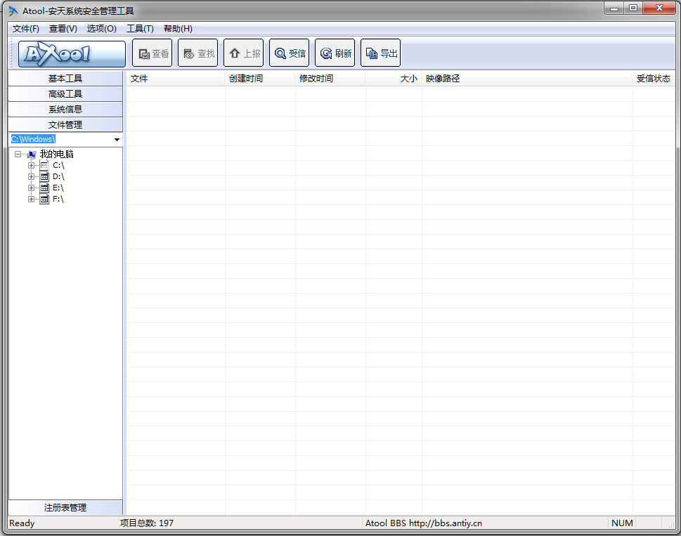 ATool是一款供高级用户使用的专业安全管理工具集,包含了多款实用的系统工具,能够实现用户对系统的安全管理,同时针对系统中的木马、后门、黑客工具等恶意程序进行检测并辅助用户进行处理。特别提供了分析模块,能够实现基于条件加权的未知木马检测体制,对系统中端口、进程、服务、自启动项、插件等内容进行严格的行为判断和特征分析,形成对每个文件的受信状态判定。