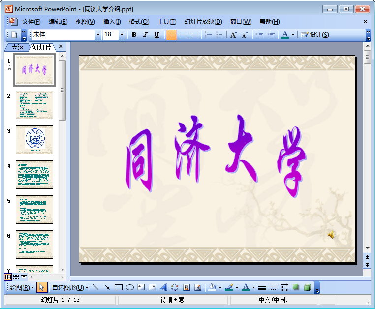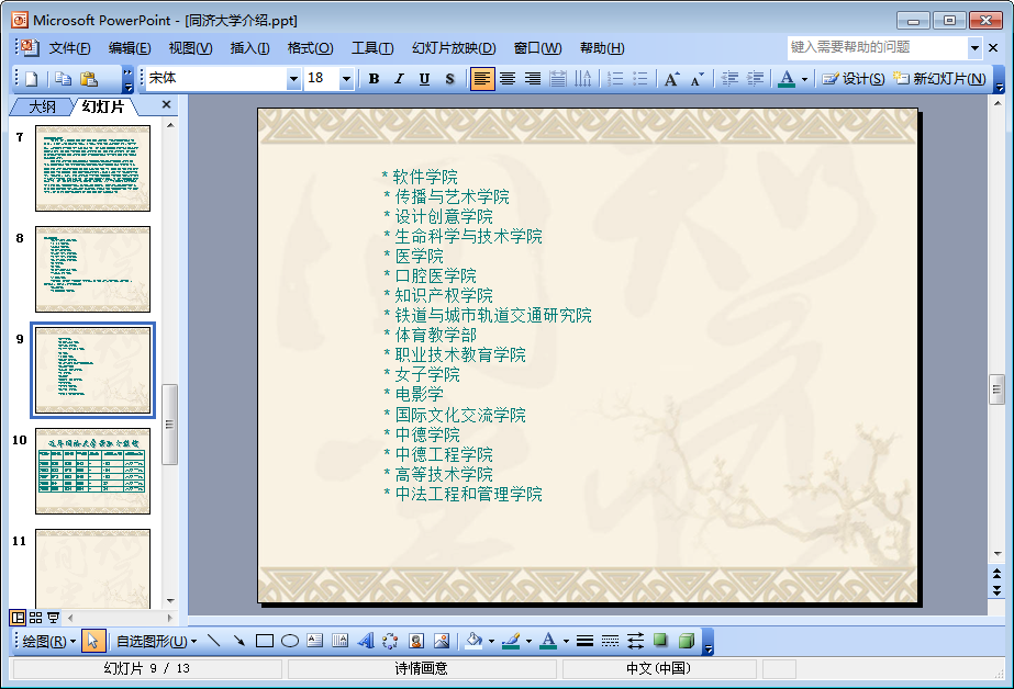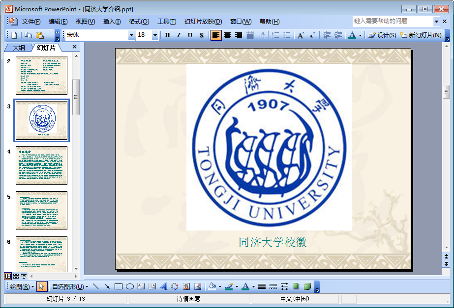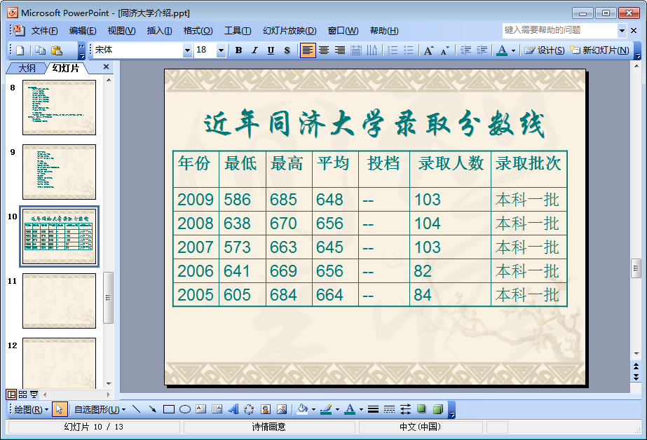 该同济大学介绍ppt共有共13页,其中1——10页为有效内容,内容介绍了同济德文医学堂、同济医工学堂、近年同济大学录取分数线等相关内容,如果你想对上海同济大学有个大概的了解,那么该上海同济大学简介ppt将会是你一个不错的选择哦!有需要的朋友快来下载吧!