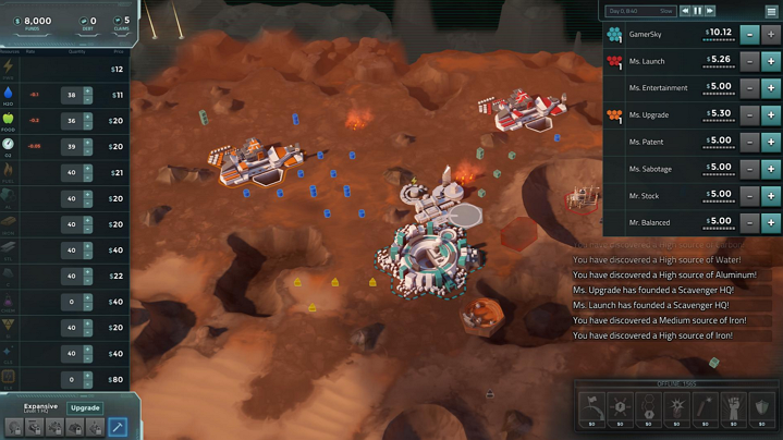 这个即时性的,并且完全由玩家主导的市场是游戏的基础。你可以购买或卖出资源、材料,甚至是食物和水。只有以低价买进,高价卖出(当然也可以在黑市上动些小脑筋)你才能赚的足够的金钱加入超豪华的外星贸易市场,在这里你可以收购对头公司,最后获得这个星球的经济主权。