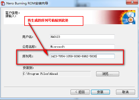 3.将序列号粘贴到安装向导填写系列号的方框中,然后点击下一步,指导安装完成。