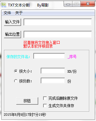 TXT文件分割是一款可以安装大小、分数进行分割的分割器。这款txt文件分割器是由一位博客的博主开发出来的小小的绿色软件,有需要的朋友可以下载使用这款txt文件分割器。