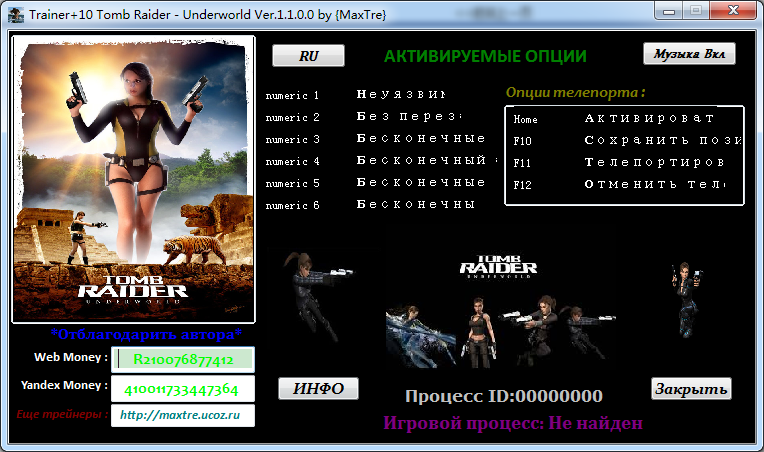 《古墓丽影8》十项修改器,支持最新1.1版本游戏,MaxTre制作,具有无限生命,无需装弹等功能,使用时先运行游戏,再启动修改器。