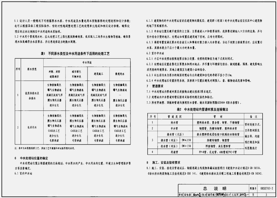 08SS703-2 《 建筑中水处理工程(二)》适用于各类民用建筑物和建筑小区5~100m3/h的中水处理工程,工业建筑中生活污水再生利用的中水处理工程可参照本图集选用。本册图集主要内容包括曝气生物滤池工艺、膜生物反应器工艺和速分处理工艺的设计说明、流程图、典型平、剖面工艺布置图;一体化设备、相关设备安装图和有关附属设施。本册图集技术工艺先进,使用方便,能有效解决设计院各专业间及设计院与专业公司间协调配合脱节的难题,对设计施工的规范化和保证质量、提高水平、加快进度及促进推广应用效果显著。