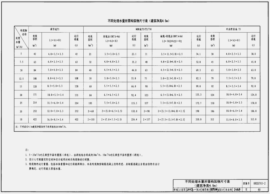 不同处理水量所需构筑物尺寸表(建筑净高4.5m)40
