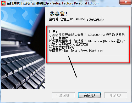 ·第一步:先安装MSSQL2000(详见),再安装金打算软件,一切全由软件自动配置。
