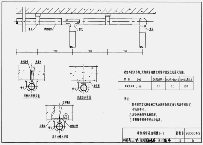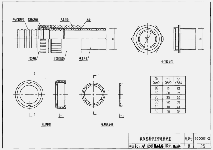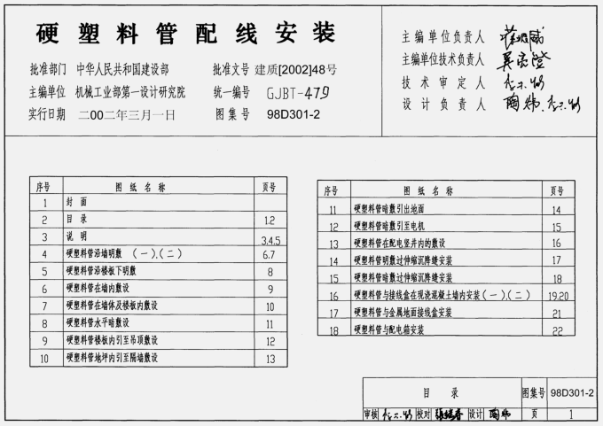 98D301-2《硬塑料管配线安装》本图集适用于工业与民用建筑室内正常环境,或有酸、碱等腐蚀和潮湿场所电气线路硬塑料管安装。包括了硬塑料管(刚性塑料管)及其配件在一般墙体、楼板及地坪内明、暗配线敷设安装方式;一般配电设备和灯具、地面接线盒等进线安装方式;硬塑料管主要配件材料,技术要求及有关规定;硬塑料管技术指标。