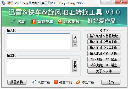 迅雷快车旋风地址转换工具可以将普通下载地址、迅雷下载地址、QQ旋风下载地址、快车下载地址进行相互转换,有需要用到的朋友赶紧来下载使用吧。