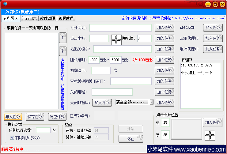 小笨鸟网站网页自动万能点击器软件是一款由小笨鸟软件工作室推出的网页点击辅助小工具。这款网页自动点击器功能强大、操作简单,能帮助用户自动点击目标网站网页,解放双手,执行各项任务。