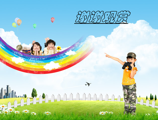 彩虹端儿童ppt模板是一份非常漂亮的ppt,幻灯片免费采用了蓝天白云,彩色的气球,飞机,2个儿童在彩虹上面,还有一个儿童拿着一个望远镜等元素,适合制作小学教育教学课件,需要的朋友点击下面的地址就就可以免费下载使用了。