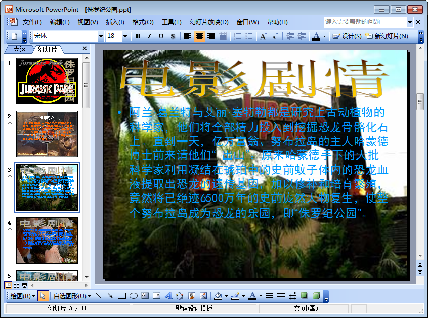 侏罗纪公园4日前正在热映,如果你不知道这部电影是怎么就进展到了第四部的,那么小编建议你可以从这部电影的第一部开始了解。本节内容小编为大家整理带来的是一份关于侏罗纪公园电影介绍的ppt——当然,从内容上来看,应该准确一点说这是一份介绍侏罗纪公园第一部到第四部的相关剧情的ppt,如果你对此还比较感兴趣的话,那么就不妨点击本文相应的下载地址来进行下载查看吧!