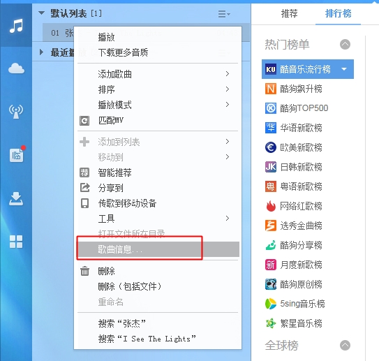 2、将酷狗音乐打开,选择要提取的歌曲,点击鼠标右键,点击歌曲信息