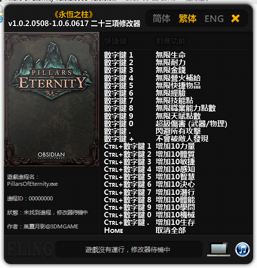 《永恒之柱》二十三项修改器,更新支持最新1.0.6.0617版本游戏,具有无限生命,无限耐力等功能,使用时先运行游戏,再启动修改器。