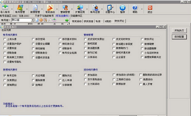 主要用于个人以及企业新浪微博维护推广营销,涵括常用的转发微博,采集微博,关注微博,发原创,话题,赞,等功能。可以实现刷屏,推广关键词,在热门微博下评论增加产品曝光率等,是一款高效的营销软件。