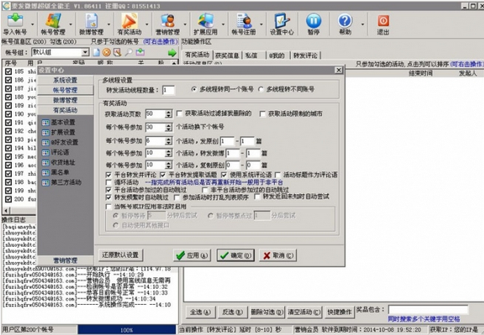 行营销推广,可以采集评论,采集转发,采集关注,采集转发+@,群发私信等,以及刷评论赞,微话题,投票等;活动方面支持砸金蛋,大转盘等微博抽奖,以及点红心(刷照片喜欢)等;功能非常强大,而全自动识别验证码是其他所有软件无法媲美的功能,不仅仅功能多,更是有强大的功能。