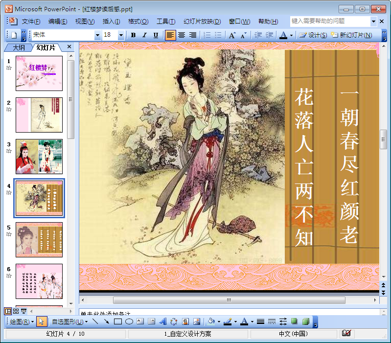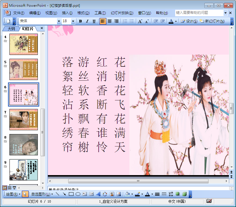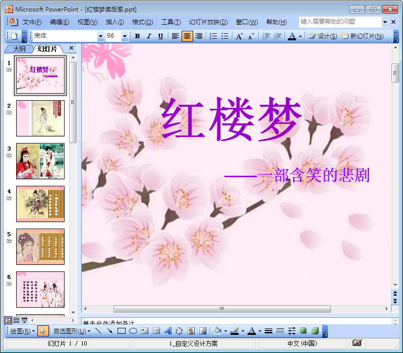 有人说封建礼教毁灭了曹雪芹,红楼梦却成就了贾宝玉。在《红楼梦》这部巨著中,那个一生命运多舛,鄙视封建世俗的曹雪芹用细腻的笔调刻画出了贾宝玉、林黛玉等众多栩栩如生的人物。本节内容小编为大家整理带来的是一份红楼梦读后感ppt,其中文字内容较少,但配有恰当合理的于红楼梦有关的ppt背景图片,所以也不失为一份不错的读后(观后)感ppt模板,以下是该红楼梦读后感ppt的相关内容介绍,需要下载得朋友点击本文相应的下载地址进行下载即可!
