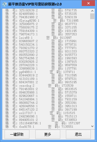 易平推迅雷VIP账号密码获取器是一款免费获取迅雷会员VIP账号和密码的软件,点击一键获取,即可获取到几百个账号,乃至上千个账号,简单实用的好软件!
